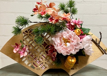 ヌーベル ブランシュブログ 扇型のお正月飾り flower 2025年12月16日 木製の扇型を使いお正月飾りです。末広の形、松や千両、金色の俵とお目出たい飾り。お花は全てアーティフィシャルフラワーですので、収納にも気を遣うことなく、ずっと飾れる作品です。芍薬や2色の蘭が華を添えて、豪華な飾りです。左側の隙間部分には、お好きな和紙を貼り、自由にデザインしていただきます。今週の秋田テルサ、来週のセンタースのレッスンで制作します。