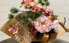 木製の扇型を使いお正月飾りです。末広の形、松や千両、金色の俵とお目出たい飾り。お花は全てアーティフィシャルフラワーですので、収納にも気を遣うことなく、...